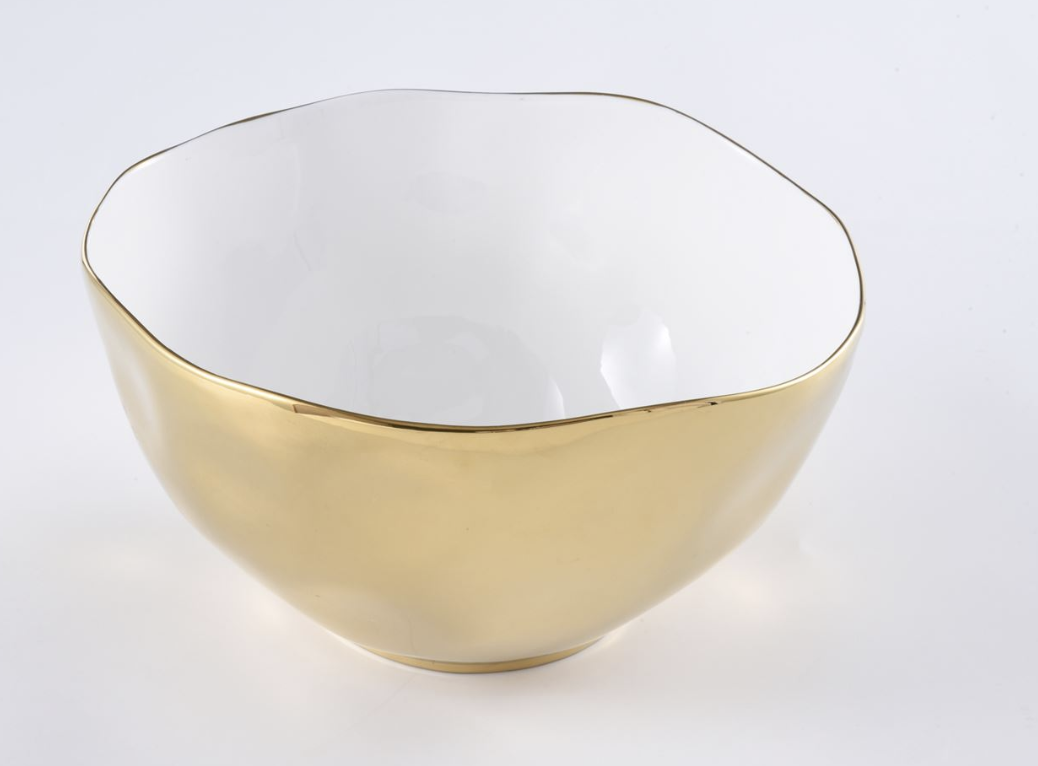 Extra Large Bowl from our Moonlight Collection This generously sized bowl is versatile and makes a great presentation! Able to stand up to even the biggest and boldest salad and pasta offerings, this bowl will be able to feed all your friends and family! Crafted in a stunning white high-fired porcelain with gold titanium. Food safe, dishwasher safe, oven safe to 500°. Tarnish and stain-free. Easy Care.