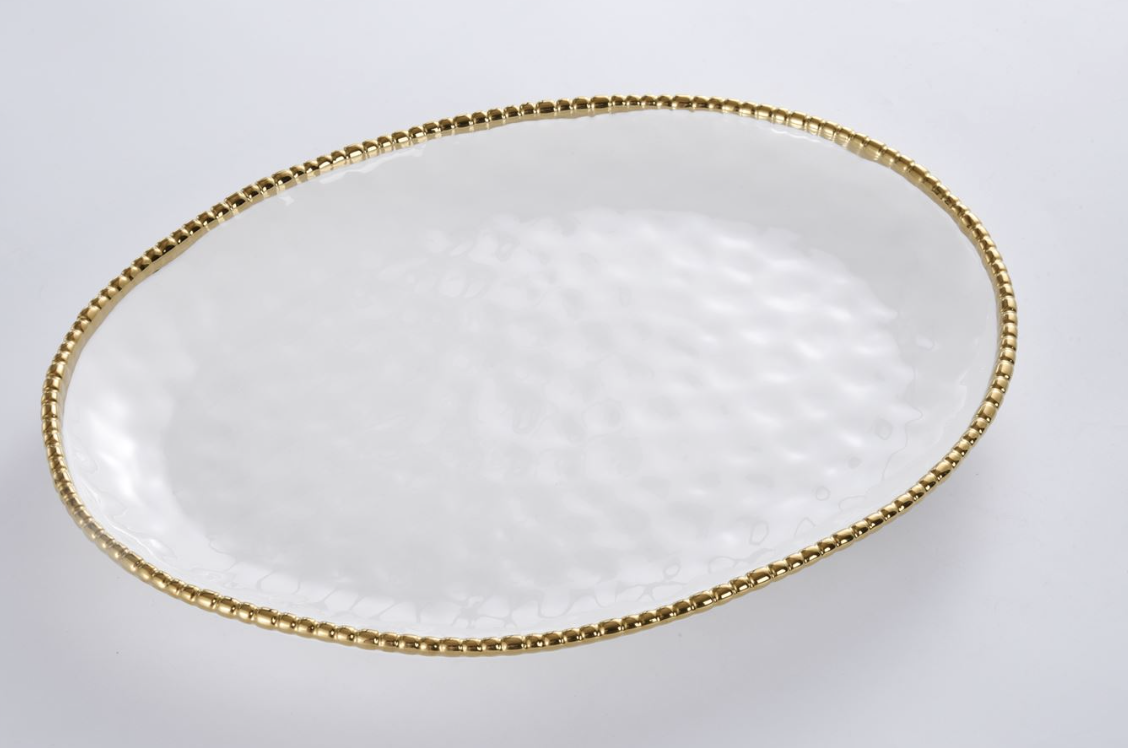 Large Oval Platter in Golden Salerno. Perfect for tempting guests with your delicious main course or hearty sides. Use for dessert to display an assortment of treats and sweets! Generously sized at over 18” in length. Gleaming white porcelain with lustrous gold beads in titanium. Food safe. Food safe, tarnish free, dishwasher safe, oven safe to 500°. Tarnish and stain-free. Easy Care.