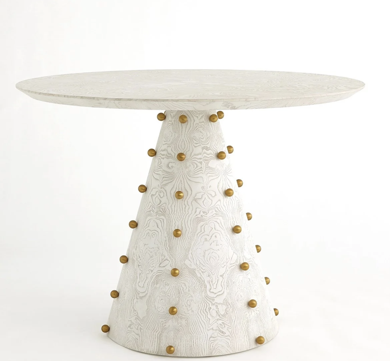 A beautiful mixed materials design, this table has a chic, modern look. Its classic rounded tabletop and conical base feature a hand-matched white burl finish for an intricate, visually textured style. Hand cast brass ball accents adorn the base for an added touch of dimension and contrast.
