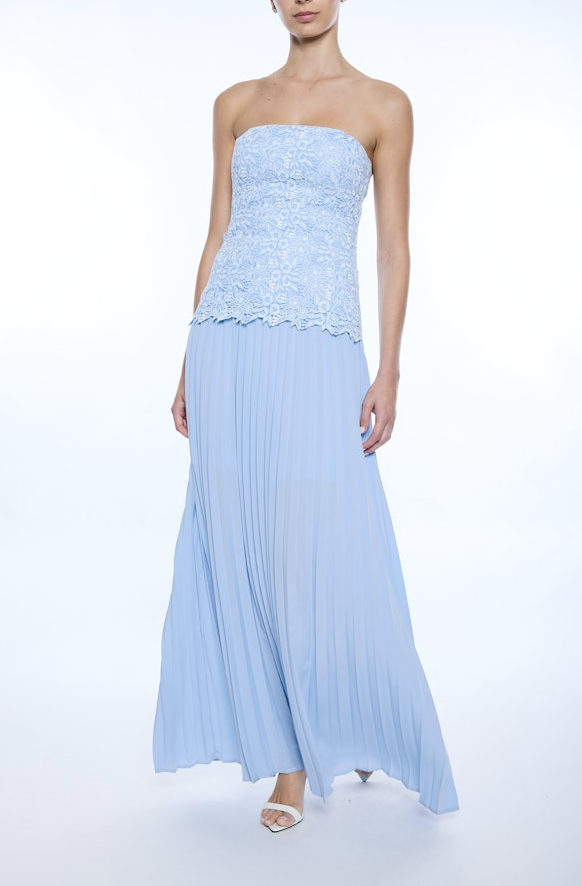 Graceful and statement-making, the Cody Two Tone Lace Pleat Dress blends delicate detail with fluid movement. Featuring a light blue and white floral lace bodice and a flowing pleated skirt below, this strapless silhouette creates a stunning contrast of texture and motion. Perfect for weddings, showers, and special occasions.