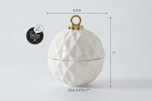 Large Ornament Bowl from our For The Holidays Collection. Great for serving candies, nuts, fruit, or condiments! A festive ornament shaped bowl in stunning and elegant white and gold metallic finished high-fired porcelain. Food safe, Dishwasher safe, Oven safe to 500°. Easy Care.