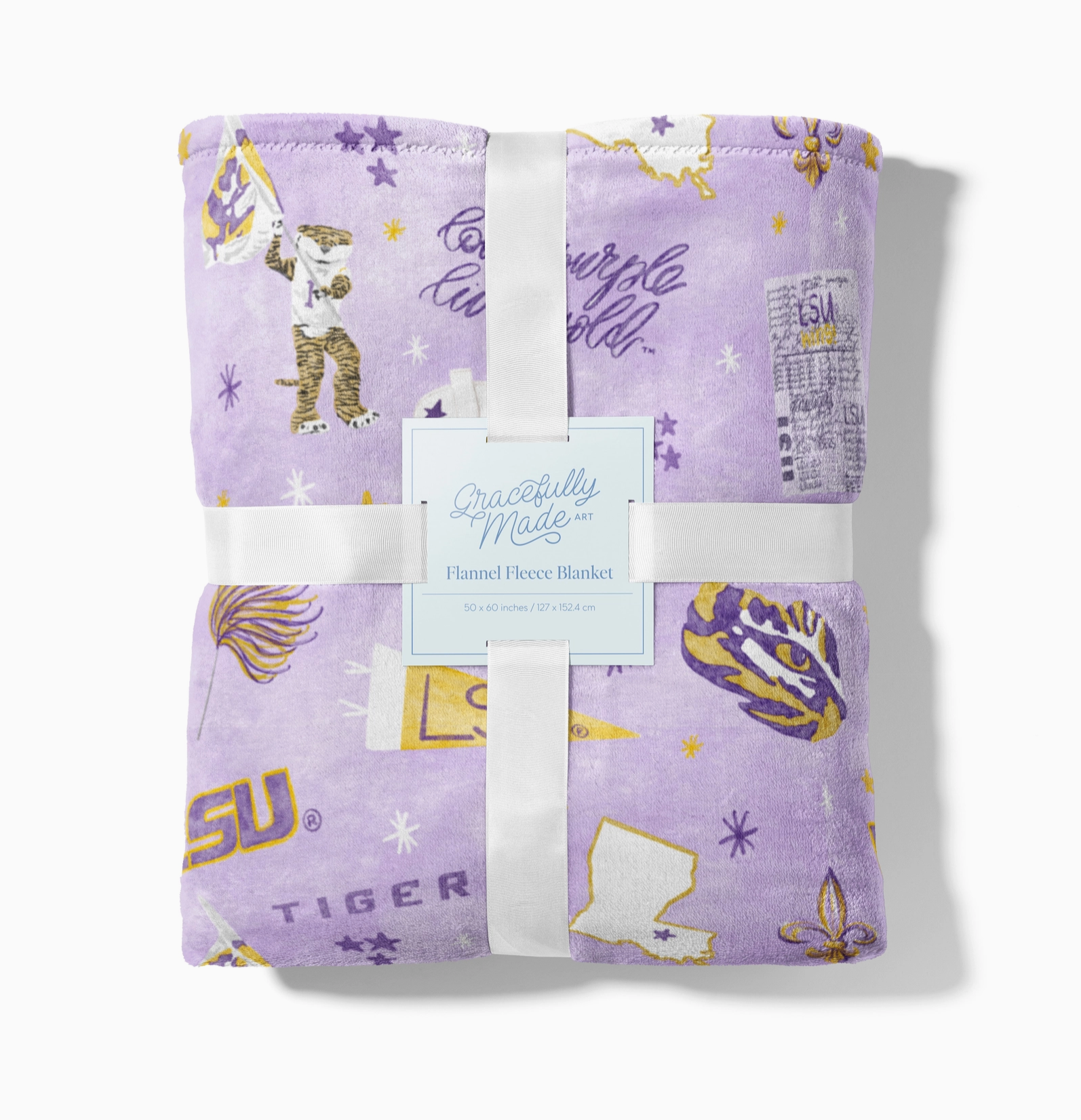 OFFICIALLY LICENSED BY LSU Wrap up in Tiger spirit with our cozy LSU flannel fleece blanket! Featuring original hand-painted illustrations like the LSU logo, Mike the Tiger, white cowboy boots, game day signs, and more—all in a fun, vibrant purple design.