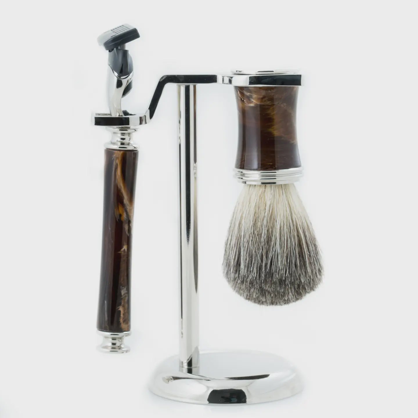 "Fusion" razor & pure badger brush with marbleized brown enamel on a chrome stand.