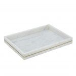 Blending style and function, this decorative tray is crafted from pure white marble and boasts a sleek rectangle silhouette that is accented by a brass inlay. Measuring 15L x 11W x 1.5H, it is a perfect size to organize essentials on your bathroom vanity or display decorative accents on your ottoman, tabletop, or dresser.